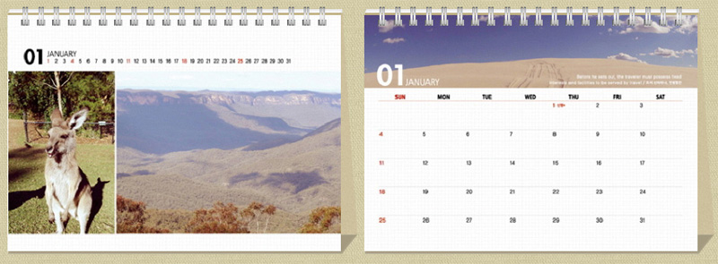 탁상용캘린더 '체크' 테마는 총 32페이지 중 13페이지가 위부분에 가로로 사진을 넣을수 있는 구성인데