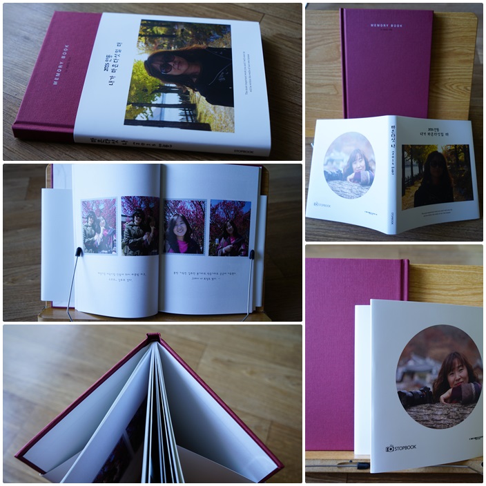 와인색깔의 탄탄한 하드커버를 넉넉한 띠지커버가 두르고 있다. 앞표지뿐 아니라 글을 넣을 수 있게 된 뒷표지에도 난 사진을 넣었다. 변화를 주기 위해 동그란 틀을 사용하여~^^