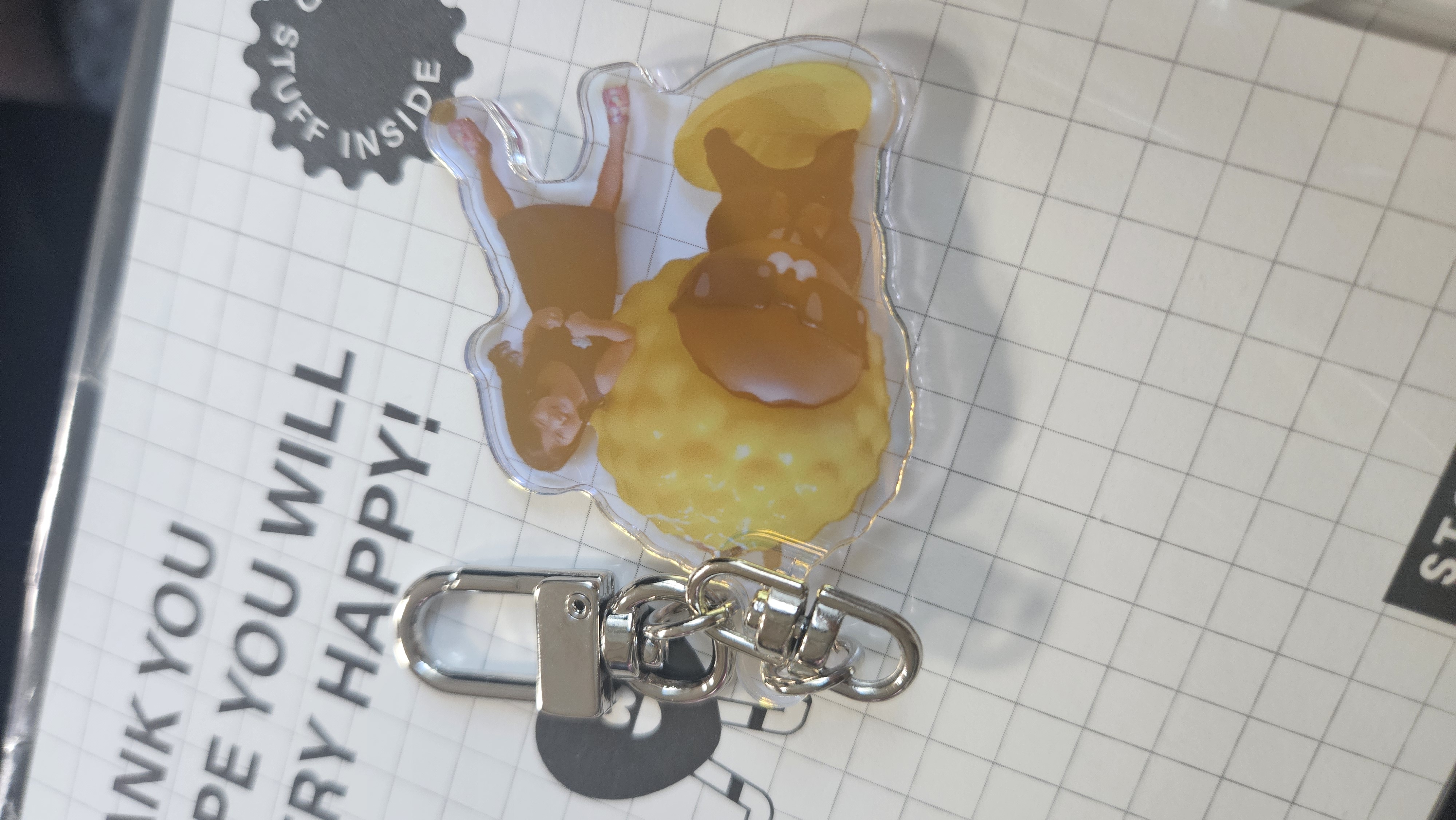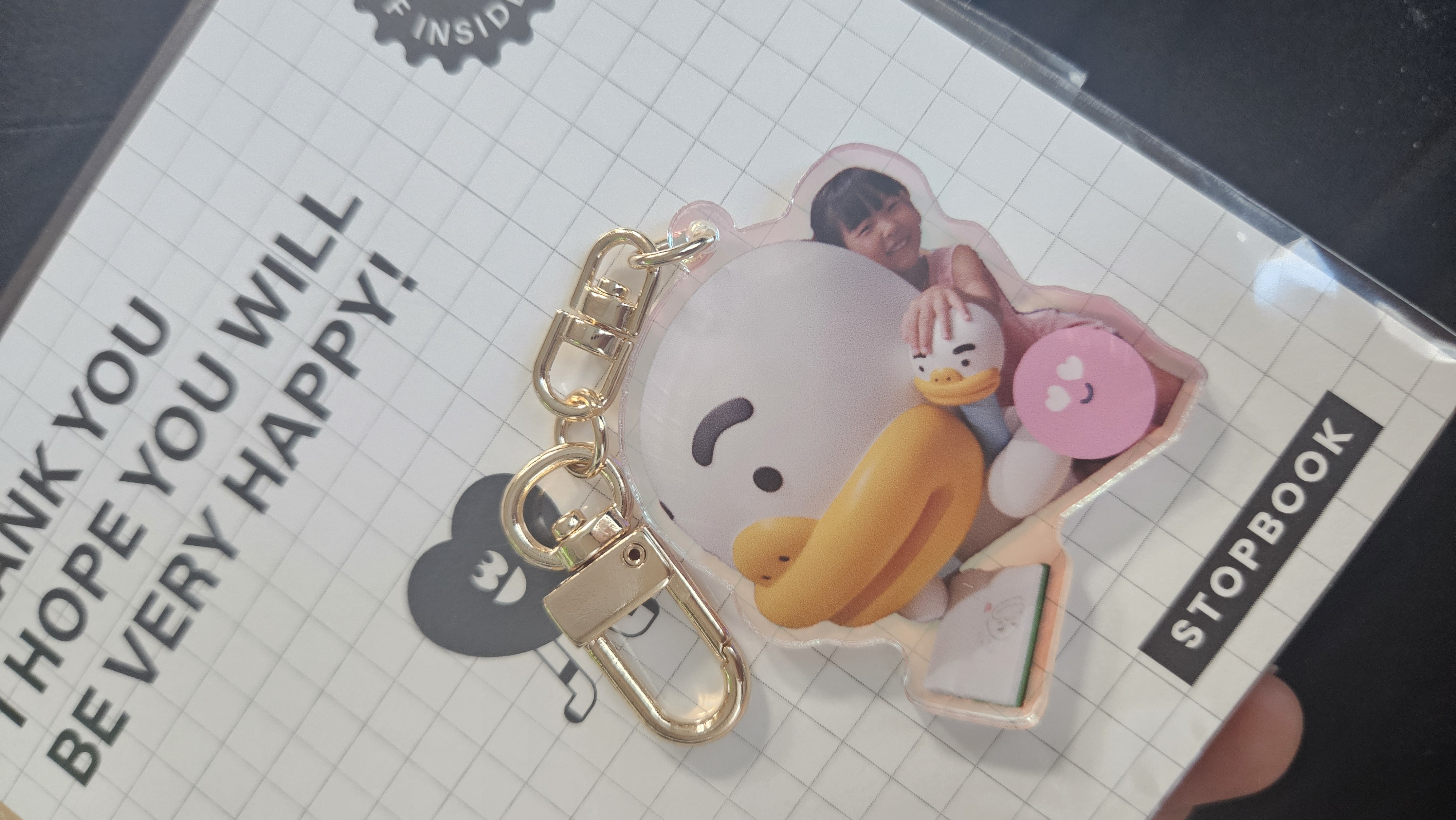 아크릴 키링의 양면에 포장용 비닐이 부착되어 있으니 꼭 떼내고 사용하세요!!